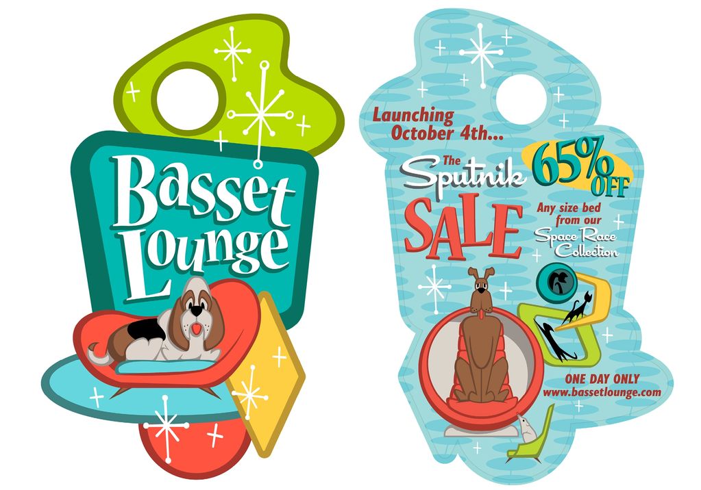 Promotional door hanger announcing a sale for Basset Lounge's mid-century style novelty pet beds
